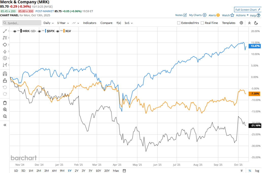 MRK stock prices have plummeted 21.9% over the past 52 weeks, notably underperforming the Health Care Select Sector SPDR Fund’s (XLV) 7.8% decline and the S&P 500 Index’s ($SPX) 14.4% gains during the same time frame.