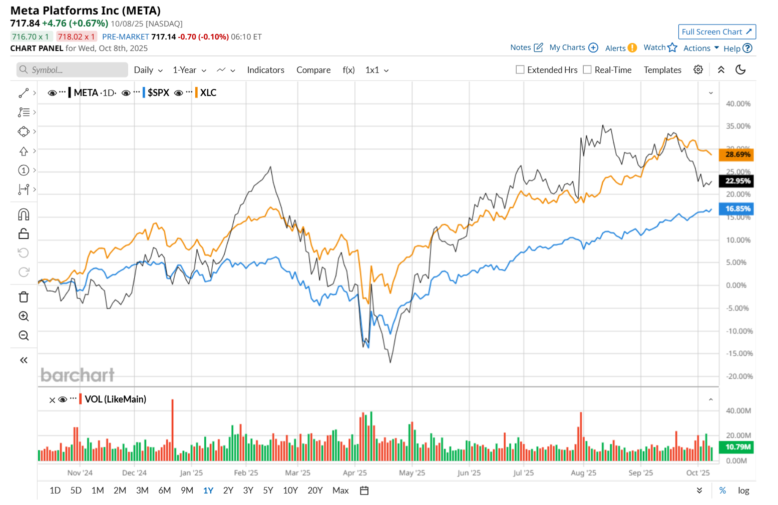 META has soared 21.1% over the past 52 weeks, outpacing the S&P 500 Index's ($SPX) 17.4% return over the same time frame. However, it has lagged behind the Communication Services Select Sector SPDR Fund’s (XLC) 27.8% uptick over the same time period.